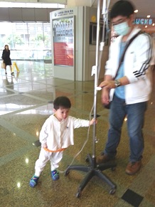 嘎逼:其實他跟我同時發病,但他只有腹部絞痛、發燒,沒有瀉肚子也沒有吐。反而,感冒症狀很明顯。總之,在悶燒一天,吐了幾次之後,喝水必吐的他終於進了急診,吊一整晚點滴。
